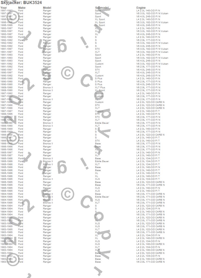Below is an abbreviated list of applications for the Block And U-Bolt Kit.Bronco II, Ranger, Ford, 1997, 1996, 1995, 1994, 1993, 1992, 1991, 1990, 1989, 1988, 1987, 1986, 1985, 1984, 1983
