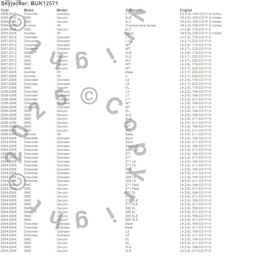 Below is an abbreviated list of applications for the Block And U-Bolt Kit.Canyon, Colorado, H3, Chevrolet, GMC, Hummer, 2012, 2011, 2010, 2009, 2008, 2007, 2006, 2005, 2004