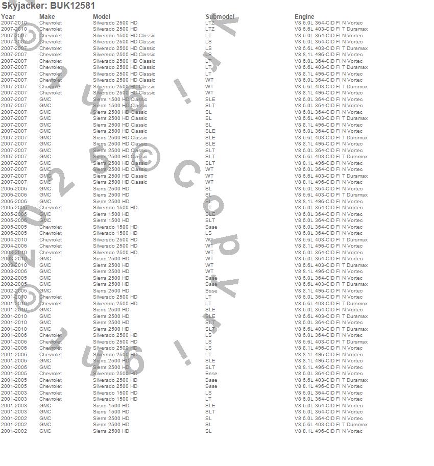 Below is an abbreviated list of applications for the Block And U-Bolt Kit.Sierra 1500 HD, Sierra 1500 HD Classic, Sierra 2500 HD, Sierra 2500 HD Classic, Silverado 1500 HD, Silverado 1500 HD Classic, Silverado 2500 HD, Silverado 2500 HD Classic, Chevrolet, GMC, 2010, 2009, 2008, 2007, 2006, 2005, 2004, 2003, 2002, 2001