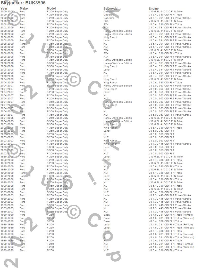 Below is an abbreviated list of applications for the Block And U-Bolt Kit.F-250 Pickup, F-250 Super Duty Pickup, F-350 Super Duty Pickup, Ford, 2009, 2008, 2007, 2006, 2005, 2004, 2003, 2002, 2001, 2000, 1999