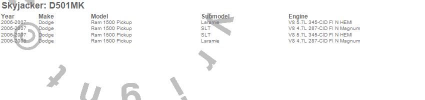 Brand: SkyjackerPart Number: D501MKLift Kit; Rear Type: 4.5-5.5 in. Lift - Incl. Front Springs - Add-A-Leafs - Steering Correction - Steering StabilizerUPC: 803696199603