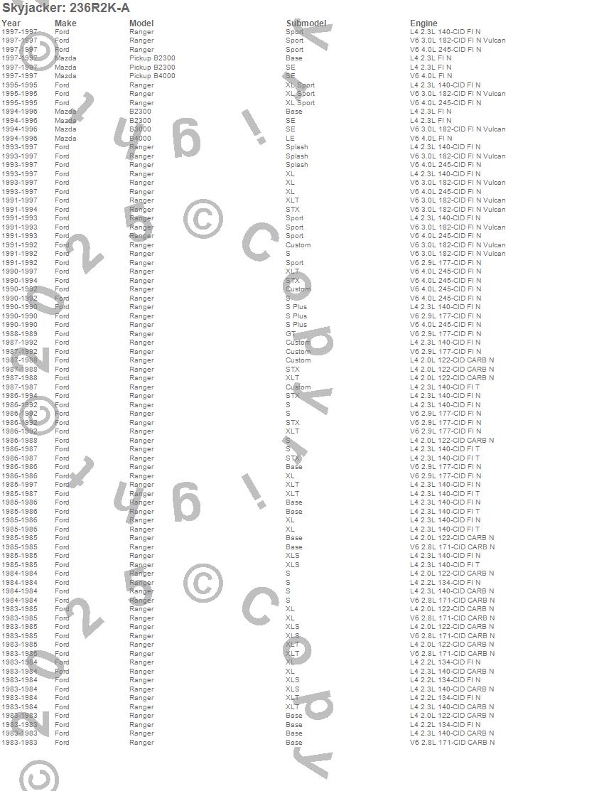 Below is an abbreviated list of applications for the Class 2 Suspension Lift Kit.B2300, B3000, B4000, Ranger, Ford, Mazda, 1997, 1996, 1995, 1994, 1993, 1992, 1991, 1990, 1989, 1988, 1987, 1986, 1985, 1984