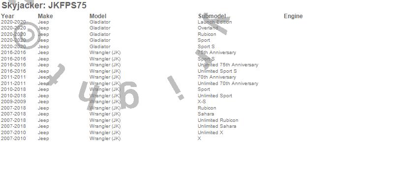 Brand: SkyjackerPart Number: JKFPS75Suspension Front Leveling Kit Type: Front - 0.75 in. Lift - PairUPC: 803696191652