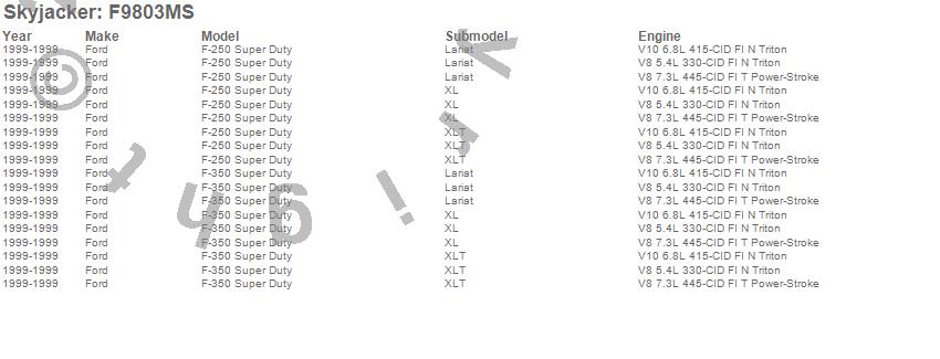 Brand: SkyjackerPart Number: F9803MSLift Kit-Suspension Component Type: 8 in. Lift - Incl. Track Bar Brkt - Fr/Rr UBolt Kit - Spring Bushings - Sway Bar End Links - Brake Lines - Vacuum TubingUPC: 803696130354