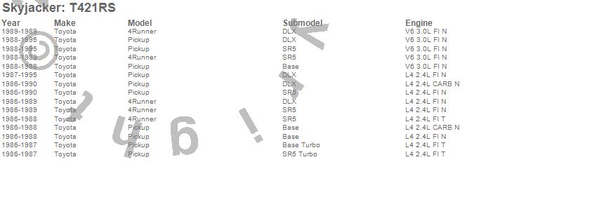 Brand: SkyjackerPart Number: T421RSLift Kit-Suspension Component Type: 4 in. Lift - Incl. 2.5 in. Wide Rear UBolt Kit - Rear Spring Bushing KitUPC: 803696162249