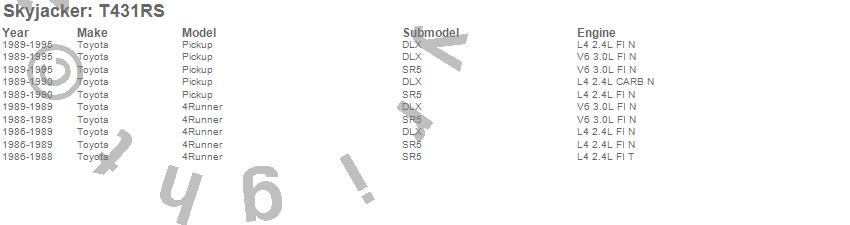 Brand: SkyjackerPart Number: T431RSLift Kit-Suspension Component Type: 4 in. Lift - Incl. 3.25 in. Wide Rear UBolt Kit - Rear Spring Bushing KitUPC: 803696162331