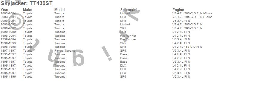 Brand: SkyjackerPart Number: TT430STLift Kit-Suspension Component Type: 3 in. LiftUPC: 803696189390
