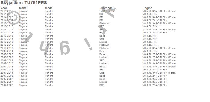 Brand: SkyjackerPart Number: TU761PRSLift Kit-Suspension Component Type: 6 in. LiftUPC: 803696196916