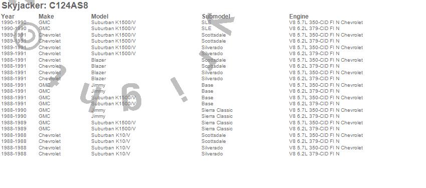 Below is an abbreviated list of applications for the Component Box For PN[C125AKS8].Blazer, Jimmy, V10 Suburban, V1500 Suburban, Chevrolet, GMC, 1991, 1990, 1989, 1988