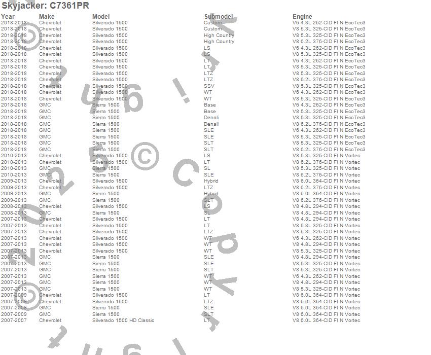 Below is an abbreviated list of applications for the Component Box For PN[C7361SK/C7361PH].Sierra 1500, Silverado 1500, Silverado 1500 HD Classic, Chevrolet, GMC, 2014, 2013, 2012, 2011, 2010, 2009, 2008, 2007