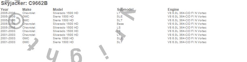 Brand: SkyjackerPart Number: C9662BLift Kit-Suspension Component Type: 6 in. Lift - Incl. XMembers - CVAxleSpcrs - BmpStpBrkts - DiffReloBrkts - DiffSkid Plt - FrtSwyBrEndLnks - Rr Add-A-Leafs - UBltsUPC: 803696202716