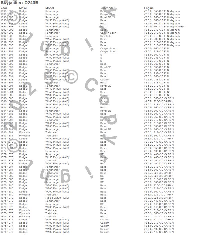 Below is an abbreviated list of applications for the Component Box For PN[D200BK].Ramcharger, Trailduster, W100 Pickup, W150 Pickup, W200 Pickup, W250 Pickup, Dodge, Plymouth, 1993, 1992, 1991, 1990, 1989, 1988, 1987, 1986, 1985, 1984, 1983, 1982