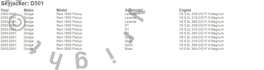 Brand: SkyjackerPart Number: D501Lift Kit-Suspension Component Type: 5 in. Lift - Incl. Steering Stab. - UBolt Kit - Rr Add-A-LeafUPC: 803696125701