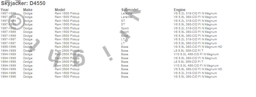 Brand: SkyjackerPart Number: D4550Lift Kit-Suspension Component Type: 4-5 in. Lift - Incl. Upper/Lower Links - Sway Bar Lowering Brkt - Bump StopsUPC: 803696125602