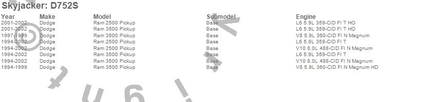 Brand: SkyjackerPart Number: D752SLift Kit-Suspension Component Type: 7 in. Lift - Incl. Trans Mount - Spacer Plate - Bump Stops - UBolt Kit - Sway Bar Brkts - Skid Plates - Steering Stab - Dual Shock BrktUPC: 803696169262