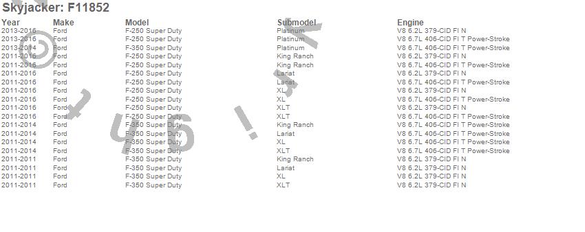 Brand: SkyjackerPart Number: F11852Lift Kit-Suspension Component Type: 8.5 in. LiftUPC: 803696205601