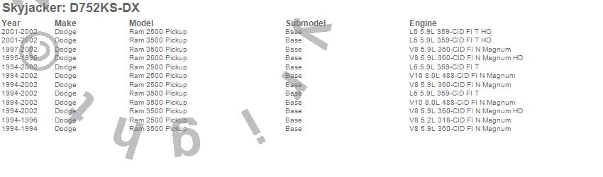 Brand: SkyjackerPart Number: D752KS-DXLift Kit; Rear Type: 7 in. Lift - Incl Fr Coil/Rr Leaf Spring - Cross Member - Skid Plate - Brake Line - Indexing Ring - UBolt Kit - Steering Stab - Dual Shock BrktUPC: 803696174570