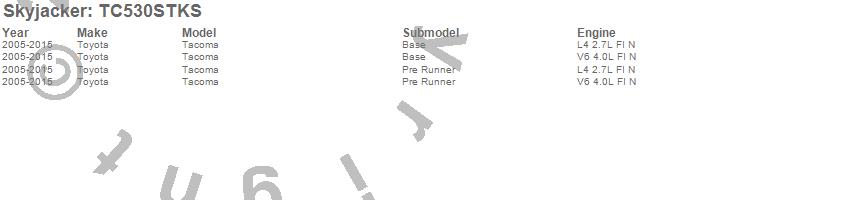 Brand: SkyjackerPart Number: TC530STKSLift Kit; Rear Type: 3 in. Lift - Incl. Main Component Box - Rear Leaf SpringsUPC: 803696189321