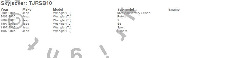 Brand: SkyjackerPart Number: TJRSB10Shock Absorber Kit w/Relocation Bracket Type: All Lift - RearUPC: 803696183350
