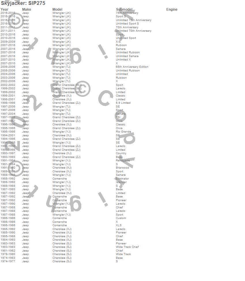 Below is an abbreviated list of applications for the Polyurethane Spacer Leveling Kit.Cherokee, Cherokee (XJ), Comanche, Grand Cherokee (WJ), Grand Cherokee (ZJ), TJ, Wrangler (LJ), Wrangler (TJ), Wrangler (YJ), Jeep, 2006, 2005, 2004, 2003, 2002, 2001, 2000, 1999, 1998, 1997