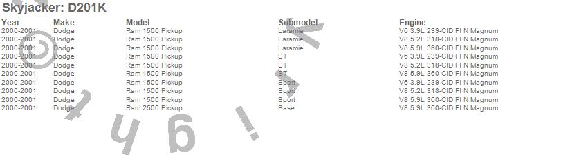 Brand: SkyjackerPart Number: D201KLift Kit; Rear Type: 2 in. Lift - Incl. Front Coil Springs - Rear Add-A-LeafsUPC: 803696169675