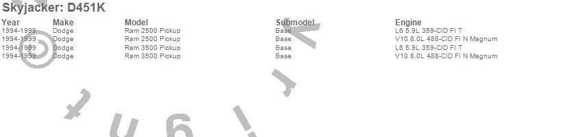 Brand: SkyjackerPart Number: D451KLift Kit; Rear Type: 4-4.5 in. Lift - Incl. Front Coil Springs - Upper/Lower Links - Sway Bar Brkt - Pitman Arm - Bump StopsUPC: 803696125022