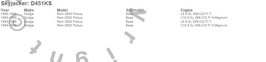 Brand: SkyjackerPart Number: D451KSLift Kit; Rear Type: 4-4.5 in. Lift - Incl. Fr Coil/Rr Leaf Spring - Uppr/Lowr Links - Pitman Arm - Bump Stop - Rr UBolts - Vent Hose - Steering StabUPC: 803696125107