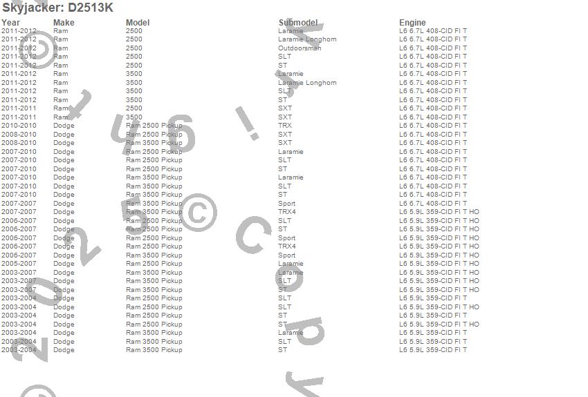 Below is an abbreviated list of applications for the Standard Class 1 Suspension Lift Kit.2500, 3500, Ram 2500 Pickup, Ram 3500 Pickup, Dodge, Ram, 2012, 2011, 2010, 2009, 2008, 2007, 2006, 2005, 2004, 2003