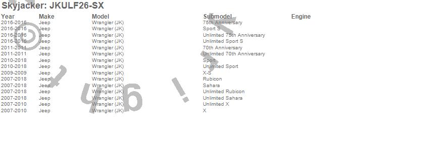 Brand: SkyjackerPart Number: JKULF26-SXSuspension Link Arm Kit Type: 2-6 in. Lift - PairUPC: 803696194240