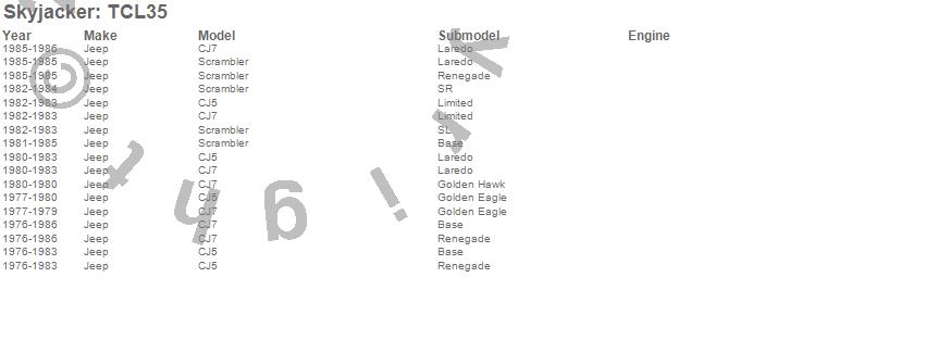 Below is an abbreviated list of applications for the Transfer Case Lowering Kit.CJ5, CJ7, Scrambler, Jeep, 1986, 1985, 1984, 1983, 1982, 1981, 1980, 1979, 1978, 1977, 1976