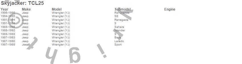 Below is an abbreviated list of applications for the Transfer Case Lowering Kit.Wrangler (YJ), Jeep, 1995, 1994, 1993, 1992, 1991, 1990, 1989, 1988, 1987