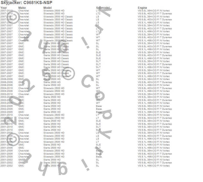 Below is an abbreviated list of applications for the Suspension Lift Kit.Sierra 2500 HD, Sierra 2500 HD Classic, Silverado 2500 HD, Silverado 2500 HD Classic, Chevrolet, GMC, 2010, 2009, 2008, 2007, 2006, 2005, 2004, 2003, 2002, 2001
