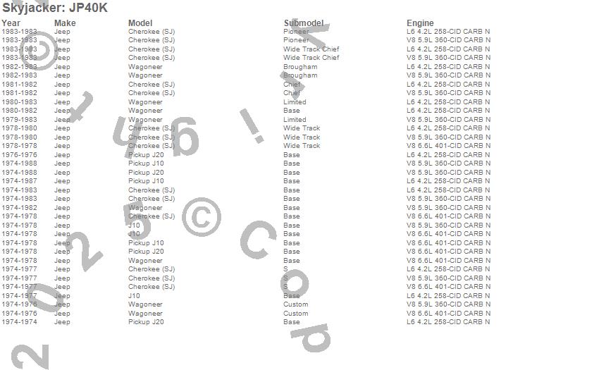 Below is an abbreviated list of applications for the Suspension Lift Kit.Cherokee, J10, J20, Wagoneer, Jeep, 1988, 1987, 1986, 1985, 1984, 1983, 1982, 1981, 1980, 1979, 1978, 1977, 1976, 1975, 1974