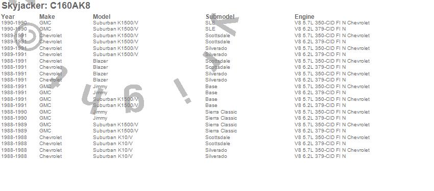 Brand: SkyjackerPart Number: C160AK8Lift Kit; Rear Type: 6 in. Lift - Incl. Front Leaf Springs - Front/Rear UBolt Kits - Bushing Kit - Rear Block - Brake Line BracketsUPC: 803696118154