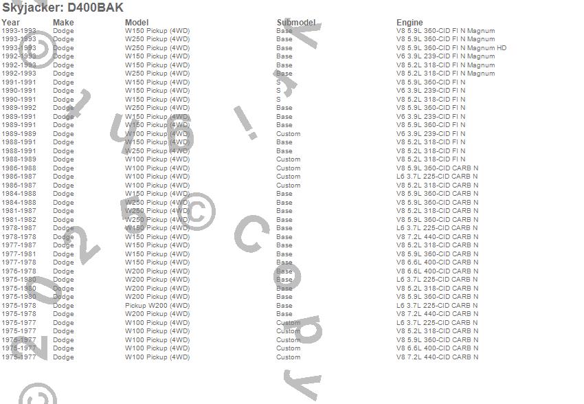 Below is an abbreviated list of applications for the Suspension Lift Kit.W100 Pickup, W150 Pickup, W200 Pickup, W250 Pickup, Dodge, 1993, 1992, 1991, 1990, 1989, 1988, 1987, 1986, 1985, 1984, 1983, 1982, 1981, 1980, 1979