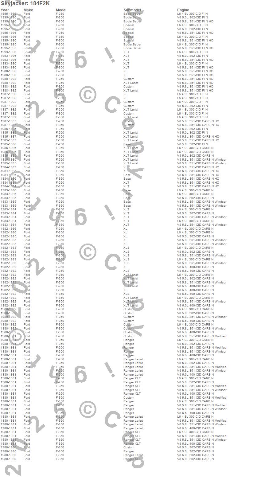 Below is an abbreviated list of applications for the Suspension Lift Kit.F-250 Pickup, F-350 Pickup, Ford, 1996, 1995, 1994, 1993, 1992, 1991, 1990, 1989, 1988, 1987, 1986, 1985, 1984, 1983, 1982, 1981, 1980