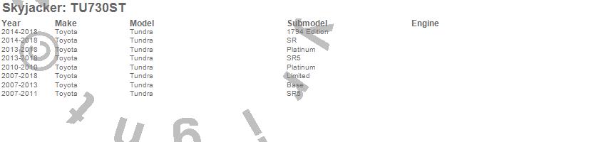 Brand: SkyjackerPart Number: TU730STSuspension Strut Assembly Kit Type: 3 in. - 2 pc.UPC: 803696194936