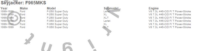 Brand: SkyjackerPart Number: F965MKSLift Kit; Rear Type: 6 in. Lift - Incl. Fr/Rr Leaf Springs - Track Bar Brkts - Front/Rear UBolt Kits - Spring Bushing Kit - Sway Bar LinksUPC: 803696130293