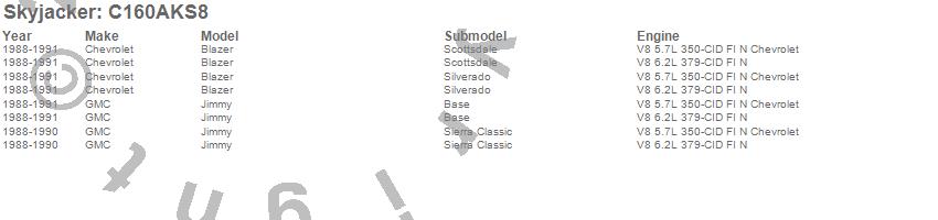 Brand: SkyjackerPart Number: C160AKS8Lift Kit; Rear Type: 6 in. Lift - Incl. Front/Rear Leaf Springs - Front/Rear UBolt Kits - Bushing Kit - Brake Line BracketsUPC: 803696118185