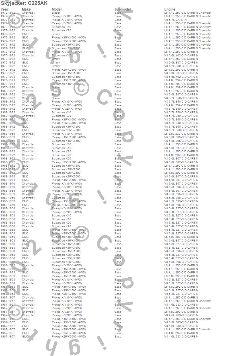 Below is an abbreviated list of applications for the Suspension Lift Kit.Blazer, Jimmy, K10 Pickup, K10 Suburban, K15/K1500 Pickup, K15/K1500 Suburban, K20 Pickup, K20 Suburban, K25/K2500 Pickup, K25/K2500 Suburban, Chevrolet, GMC, 1972, 1971, 1970, 1969, 1968, 1967