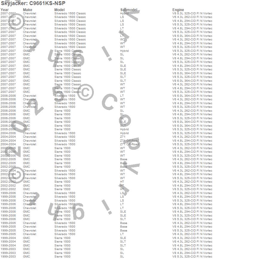 Brand: SkyjackerPart Number: C9661KS-NSPLift Kit; Rear Type: 6 in. Lift - Incl. New Rear Replacement Leaf Springs - No Skid PlateUPC: 803696193229