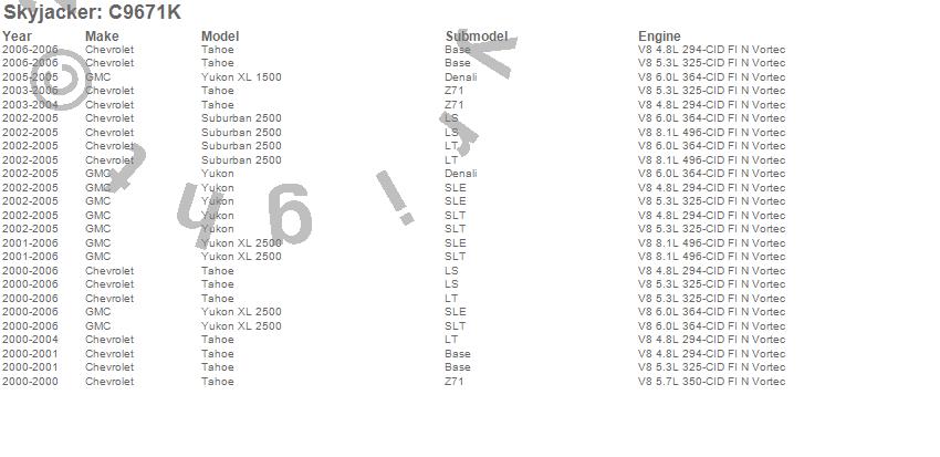 Below is an abbreviated list of applications for the Suspension Lift Kit.Suburban 2500, Tahoe, Yukon, Yukon XL 1500, Yukon XL 2500, Chevrolet, GMC, 2005, 2004, 2003, 2002