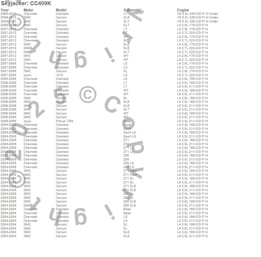 Brand: SkyjackerPart Number: CC409KLift Kit; Rear Type: 4in.Lift - Incl.Strng.Knkls - X-Mbrs - BmpStpExt. - TrsnBrRelo./SwyBrLow/Diff.Relo.Brkts. - DrvShftSp. - Rr.AddALf - Fr.BrkLn - UBlt - InstallTime8Hrs.UPC: 803696204321