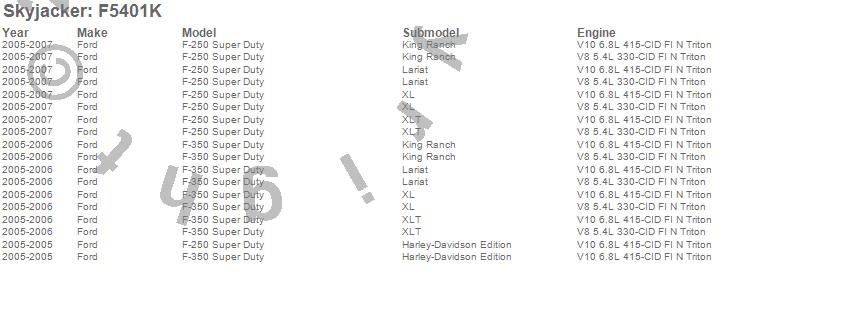 Brand: SkyjackerPart Number: F5401KLift Kit; Rear Type: 4 in. Lift - Incl. Blocks And U-BoltsUPC: 803696184357