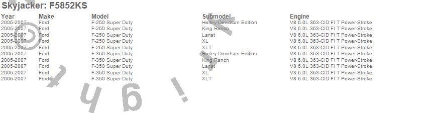 Brand: SkyjackerPart Number: F5852KSLift Kit; Rear Type: 8 in. Front/Rear Lift - Incl. Front Coil Springs - Component Box PN[F5852B] - System Box PN[F5852AS] - Rear Leaf SpringsUPC: 803696183794