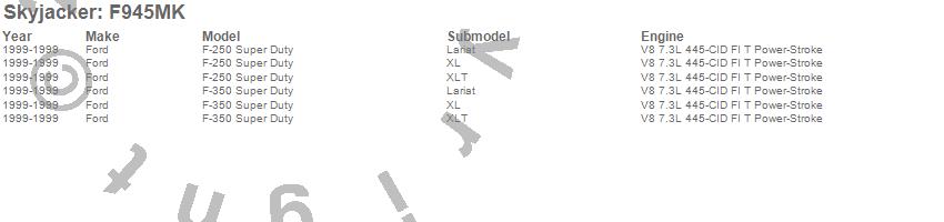 Brand: SkyjackerPart Number: F945MKLift Kit; Rear Type: 4 in. Lift - Incl. Fr Leaf Springs - Track Bar Brkt - Fr/Rr UBolt Kits - Spring Bushing Kit - Rr Block - Sway End LinksUPC: 803696130064
