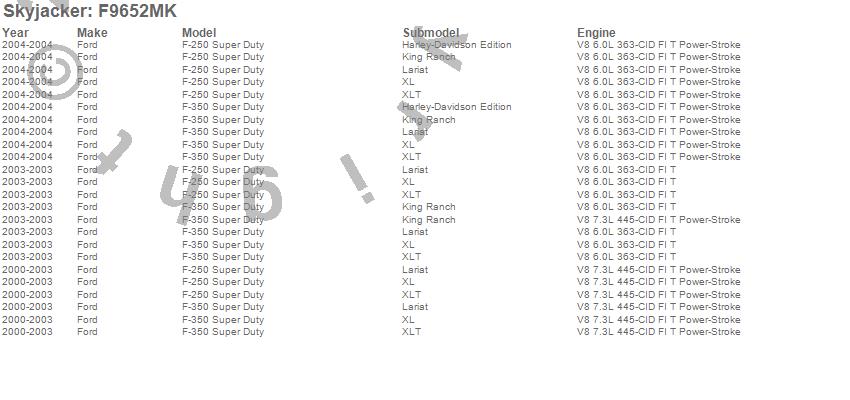 Brand: SkyjackerPart Number: F9652MKLift Kit; Rear Type: 6 in. Lift - Incl. Fr Leaf Springs - Track Bar Brkts - Fr/Rr UBolt Kits - Spring Bushings - Rr Block - Sway Bar End LinksUPC: 803696130248
