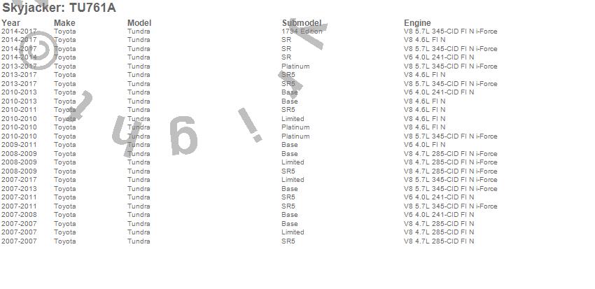 Brand: SkyjackerPart Number: TU761ALift Kit-Suspension Component Type: 6 in. LiftUPC: 803696196787