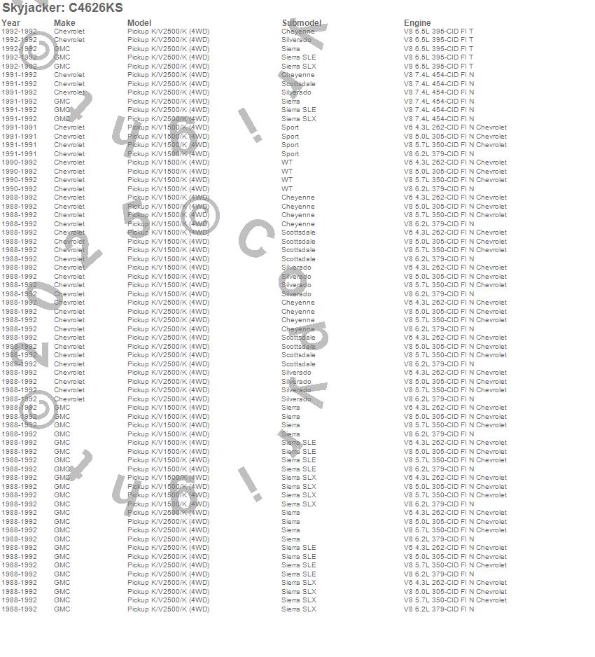 Below is an abbreviated list of applications for the Suspension Lift Kit.K1500 Pickup, K2500 Pickup, Chevrolet, GMC, 1992, 1991, 1990, 1989, 1988