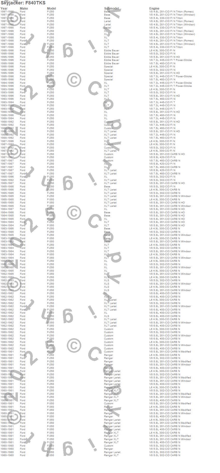 Brand: SkyjackerPart Number: F840TKSLift Kit; Rear Type: 4 in. Lift - Incl. Front/Rear Leaf Springs - Hinge Brkts - Front/Rear UBolt Kits - Spring Bushing KitUPC: 803696129457